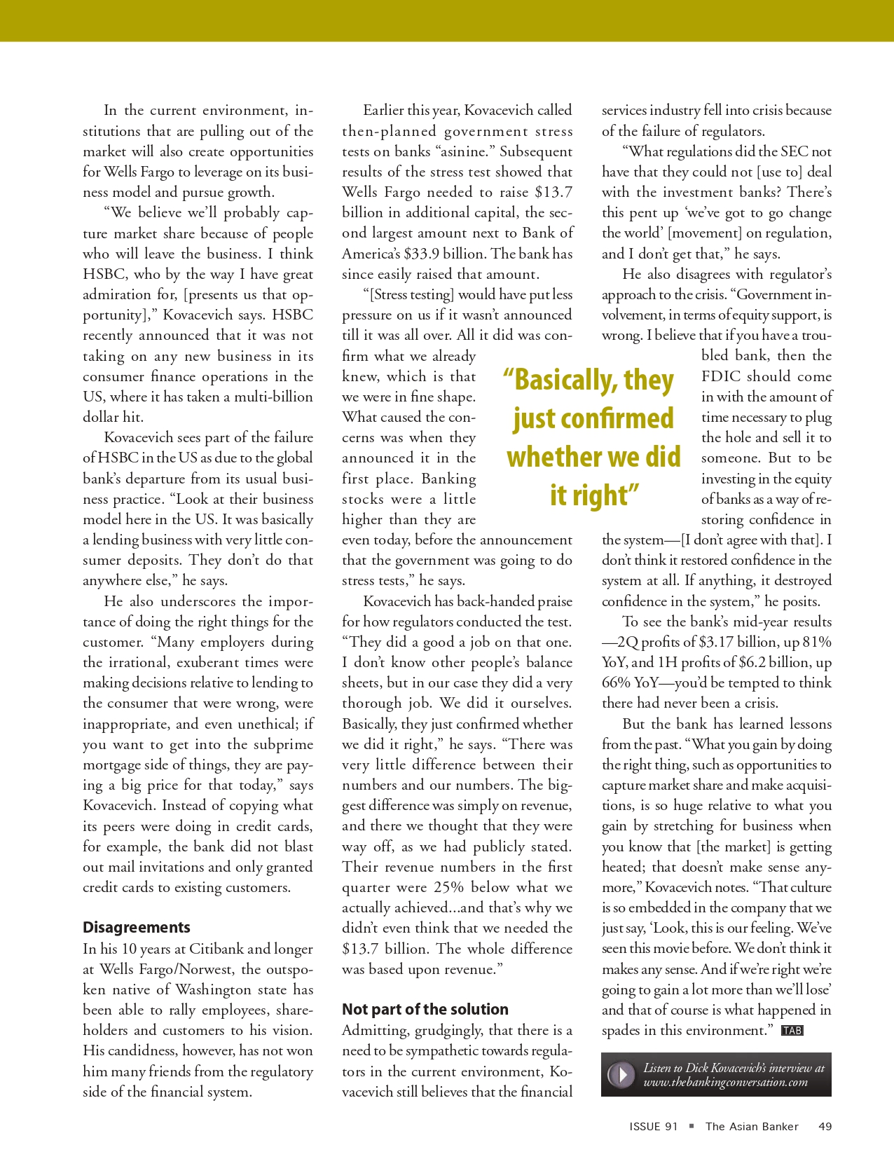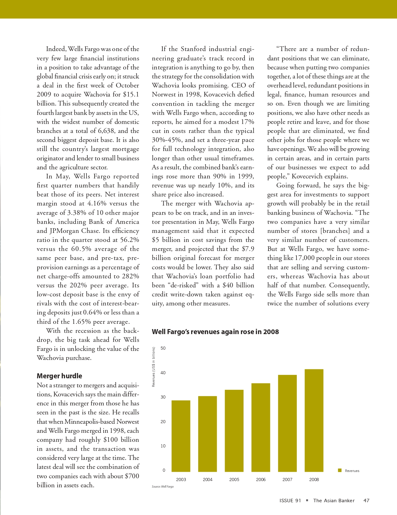 The chairmen of three of the world’s largest banks talk to us about their post-crisis strategies; HSBC’s Green expects the global bank to be more Asia emerging markets-focussed, BBVA’s Gonzalez reflects on lessons learned from victory and defeat, while Wells Fargo’s Kovacevich speaks about the merger with Wachovia.
