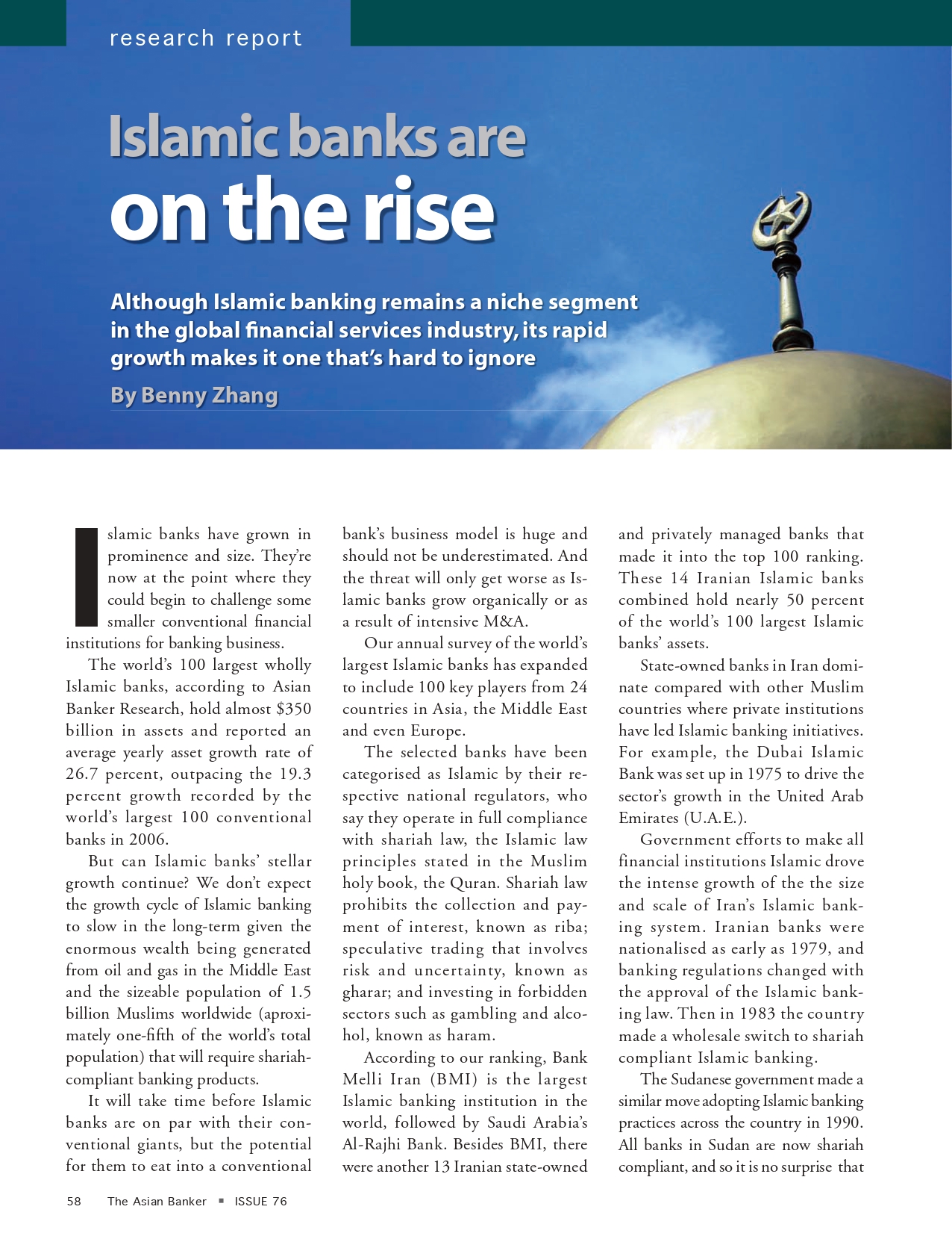 Our ranking of the world's 100 largest Islamic banks; interview with Philippine central bank governor Amando Tetangco on the opportunities and challenges of a strengthening peso.