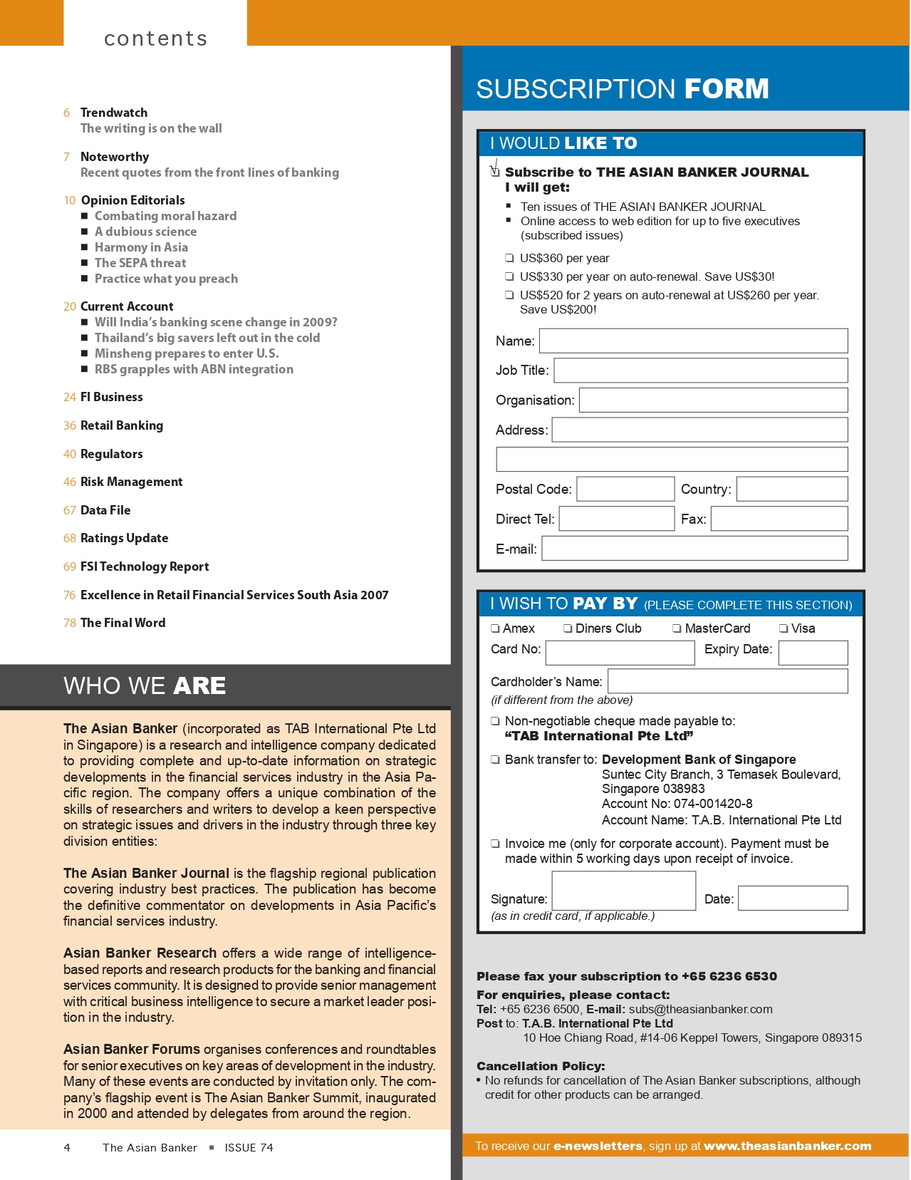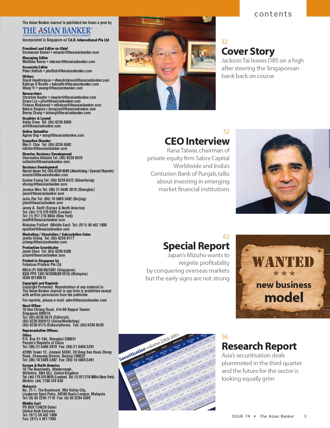 Outgoing DBS CEO Jackson Tai says the bank needs a risk-taker to grow the business; includes a research report on Asia's stunted securitisation market; an interview with Centurion Bank of Punjab's CEO Rana Talwar on their unconventional investment strategy and his optimism with emerging market banks and.